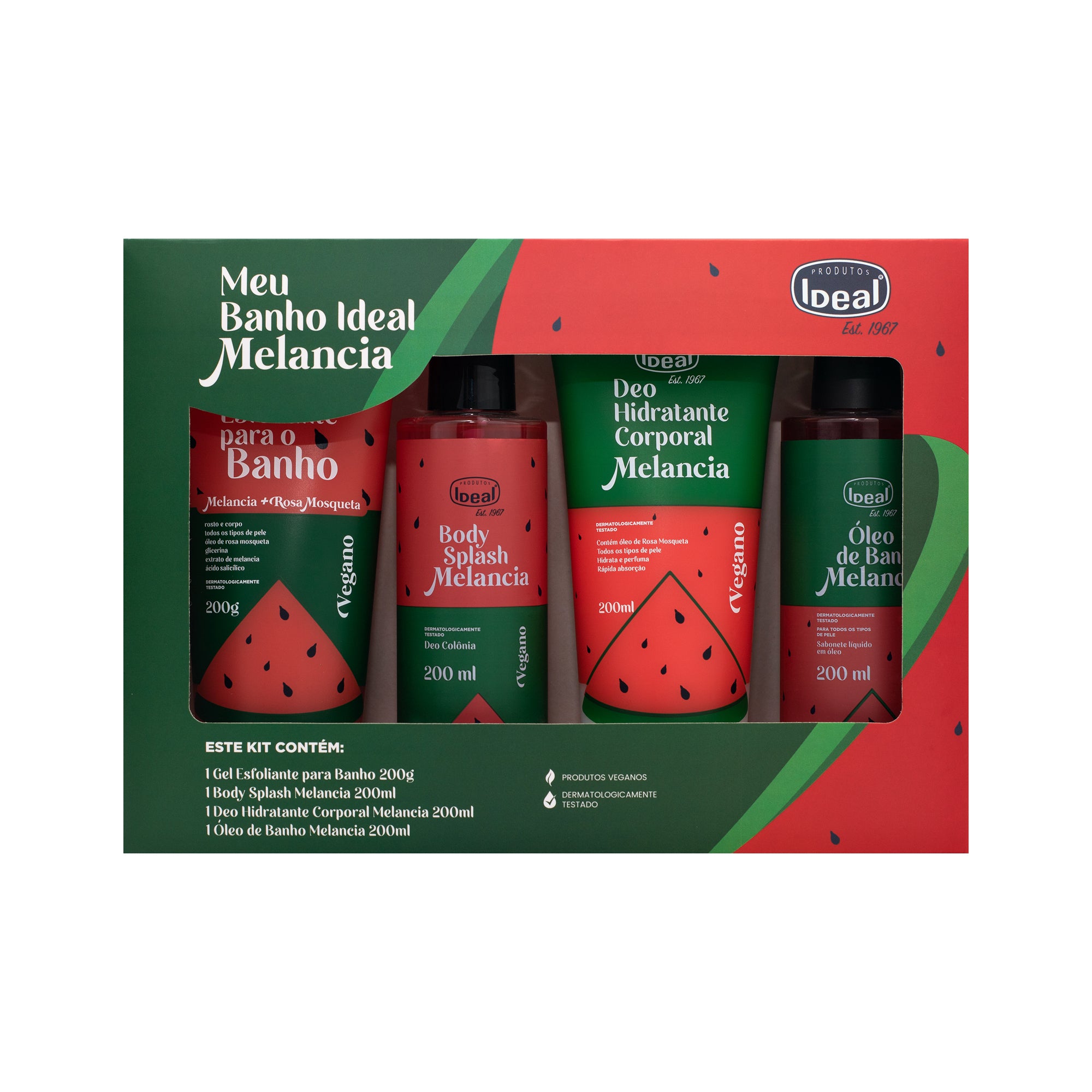 O Meu Banho Ideal é um kit completo de rotina de autocuidado focada em refrescância e hidratação, com fragrância de Melancia . O óleo de banho prove uma espuma cremosa e limpeza suave, o esfoliante ajuda a renovar a pele, o hidratante é leve e de rápida absorção, o body splash finaliza, provendo uma perfumação duradoura.